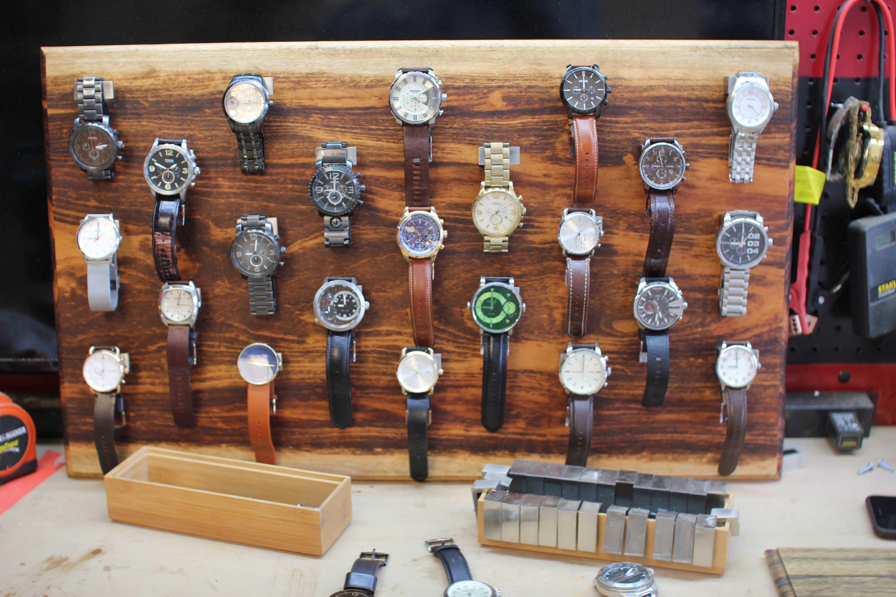 Our Fanatik Tikdoks are each considered a special order.  They start at $500 and are based on the woods that are available.  The boards need to be at least 16” across in order to house 23 watches and exotic woods in that width are hard to come by.  Each one is made of a single piece of hardwood that is milled down to 1/2 inch thick.  These are available in Black Limba, Padauk, Purple Heart and Zebra Wood.  The one pictured here is from the Zebra Wood family.  Each one is finished with Rubio Monocoat to seal the wood, accentuate the grains, and bring out the beautiful colors.